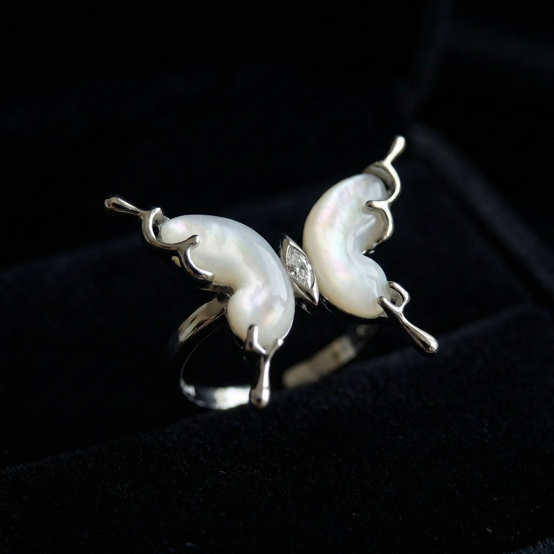 A dreamy adjustable ring featuring iridescent mother-of-pearl wings and a sparkling marquise crystal center. Elegant, lightweight, and perfect for everyday luxury.