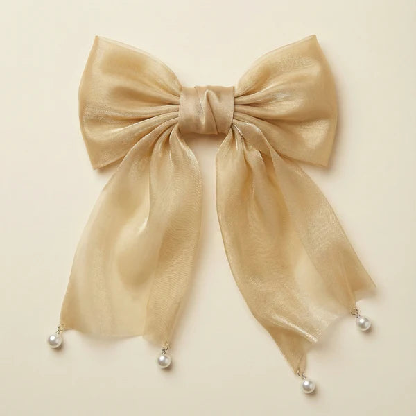 🎀 Champagne Organza Bow – Soft organza bow with pearl drop details
