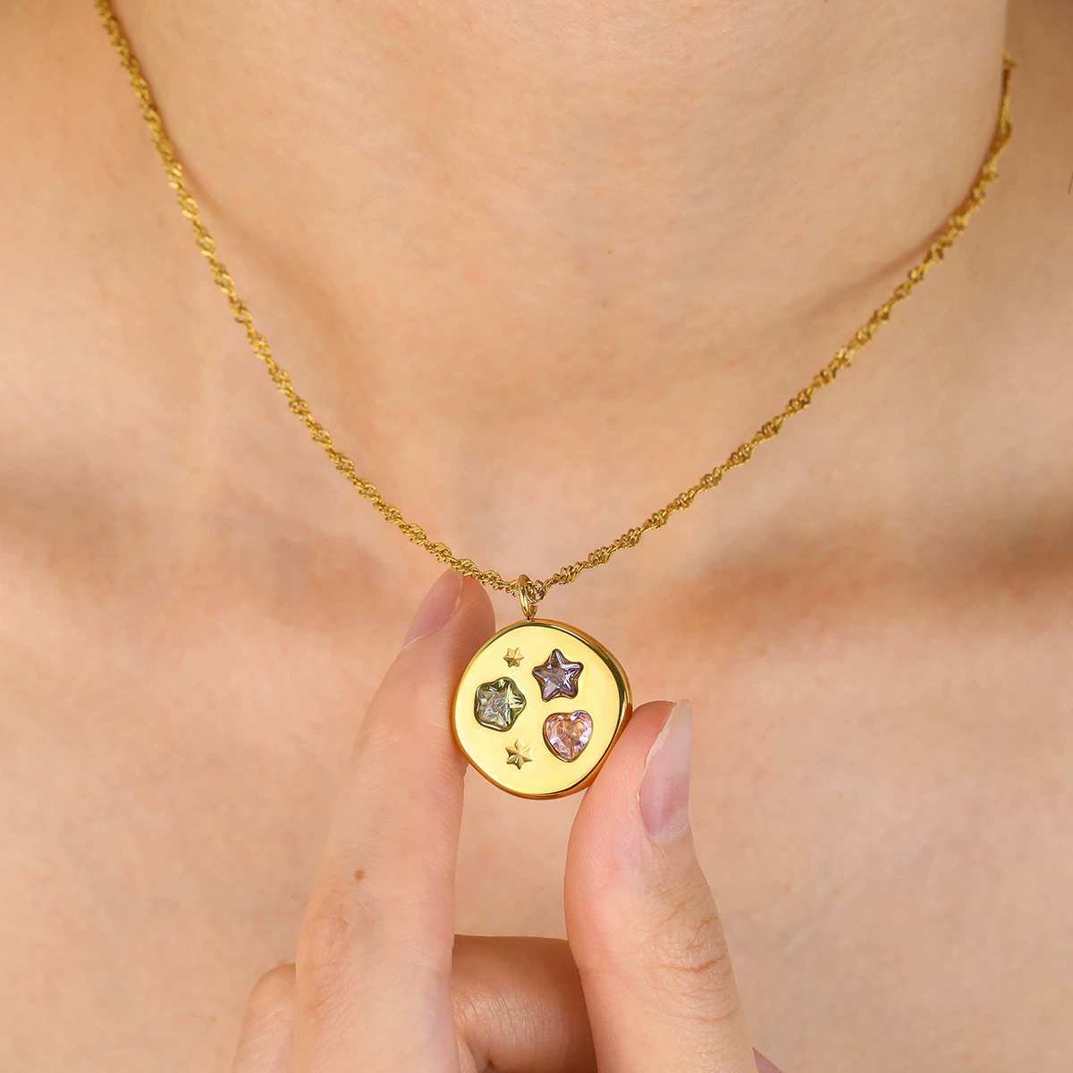 Illuminate your style with the Cosmic Glow Amethyst Necklace, a radiant blend of elegance and cosmic charm. Crafted with a lustrous gold-plated pendant, this necklace features a striking violet amethyst crystal paired with shimmering star motifs adorned with delicate cubic zirconia.