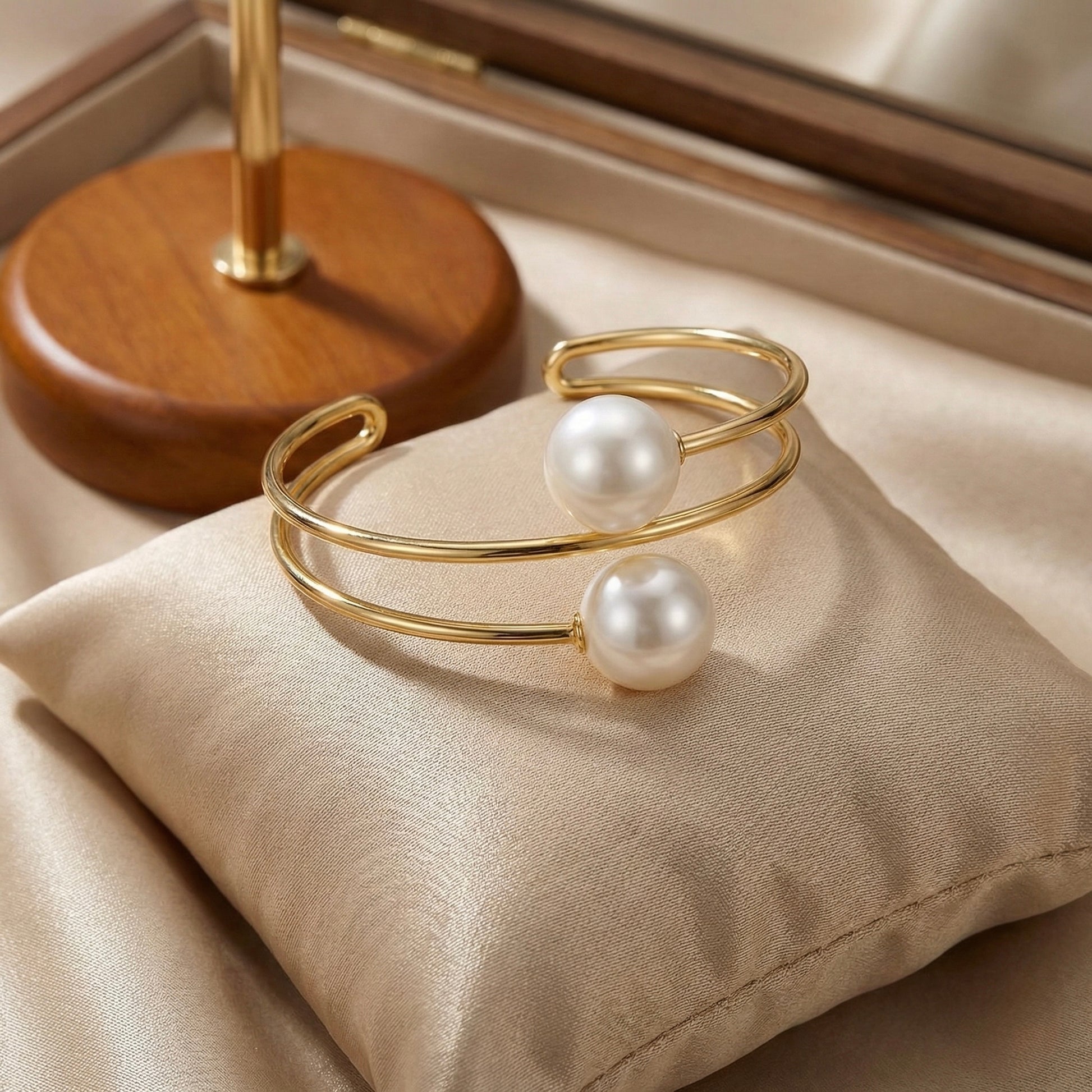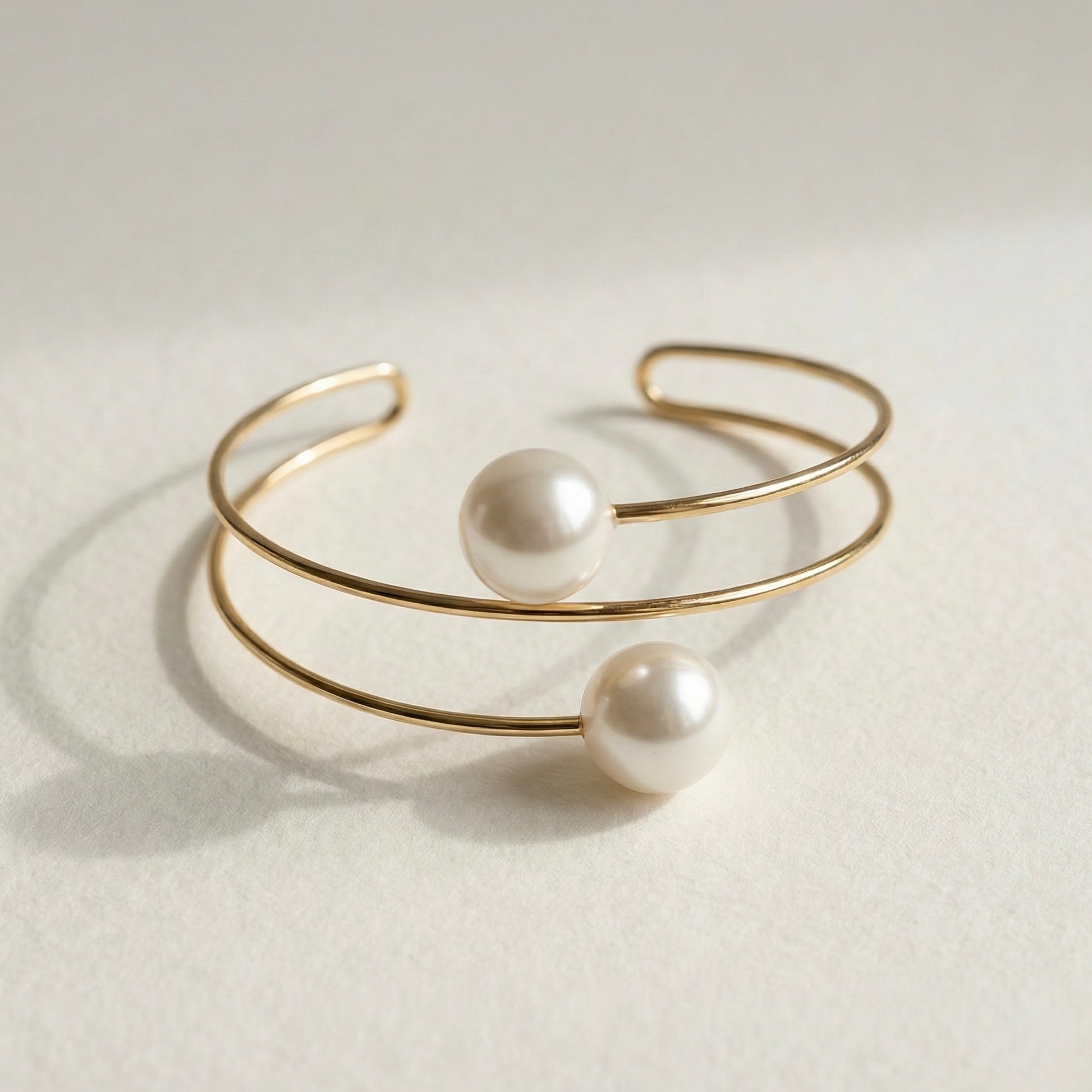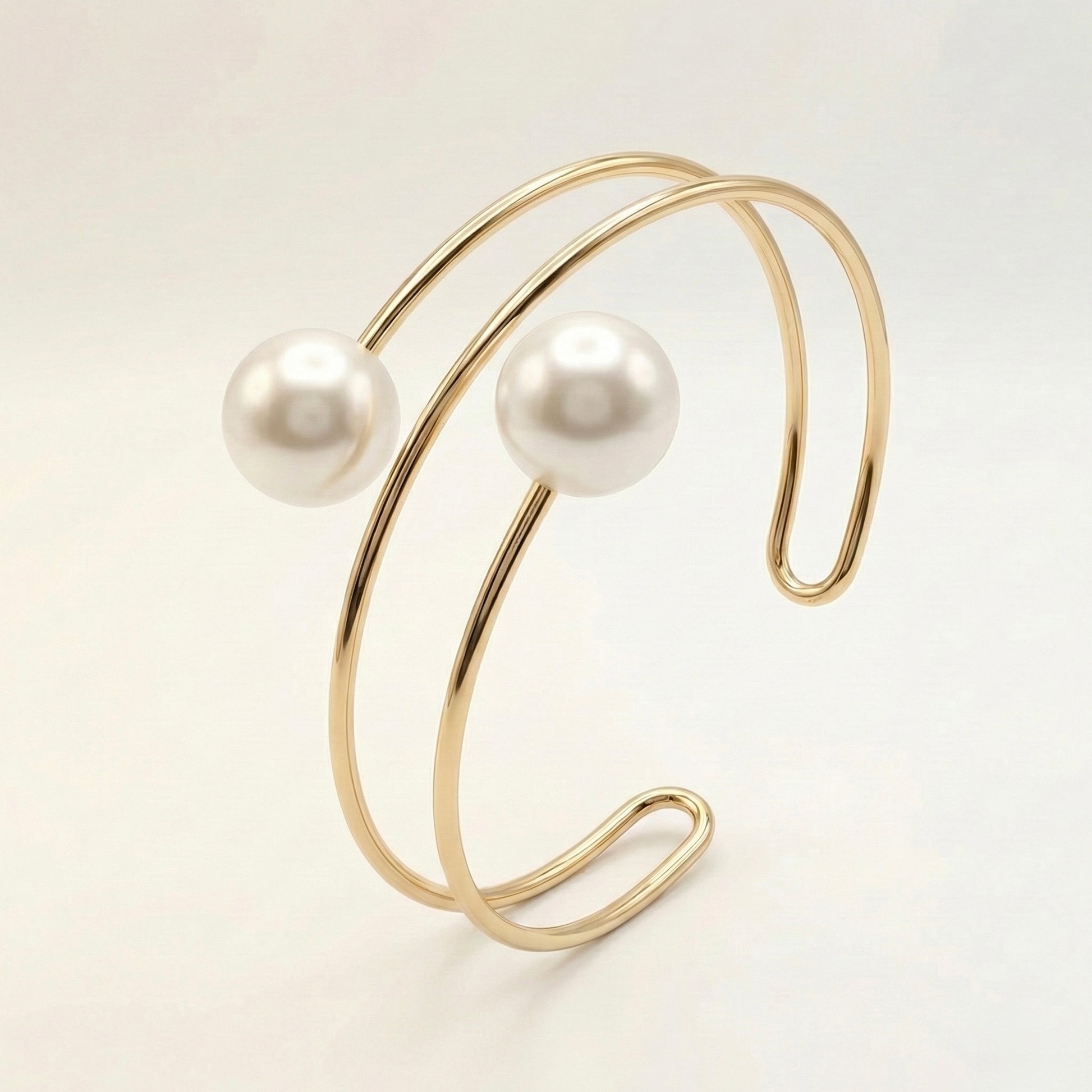 This refined open bracelet features two luminous pearl spheres placed on sleek champagne-gold curved bands, creating a graceful balance of modern minimalism and classic beauty. The open cuff design ensures comfort, easy wear, and a perfect fit for every wrist.