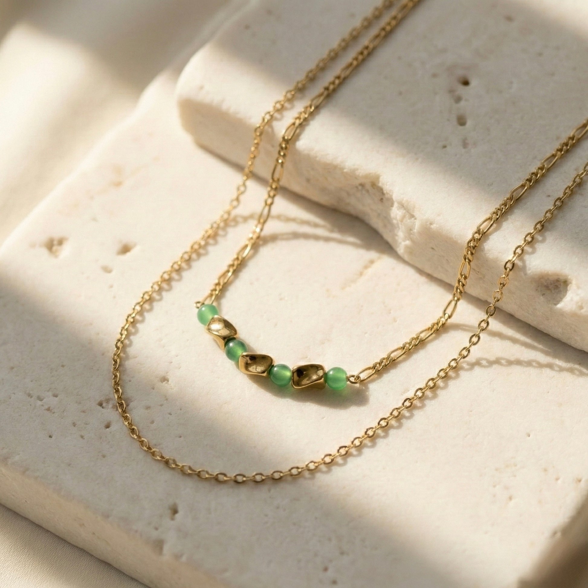 A dual-layer gold necklace with soft green beads. Minimal, elegant, and perfect for everyday layering.