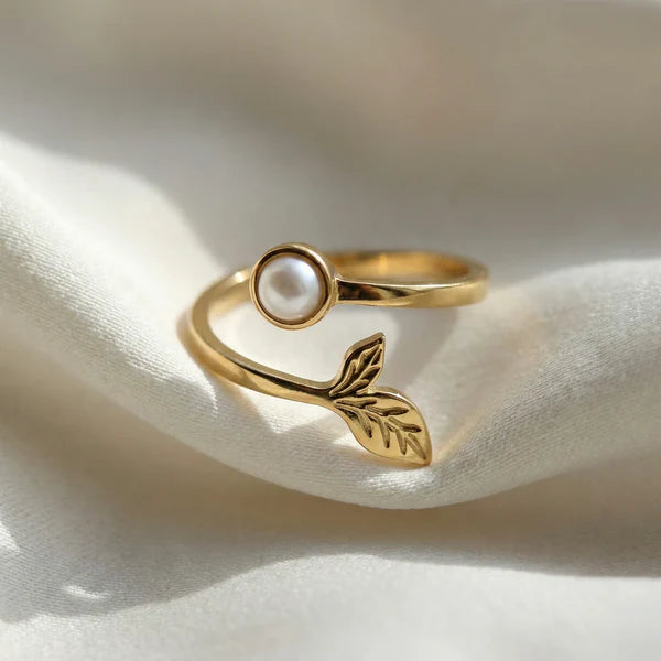 • Pearl Leaf Ring – Minimal gold-tone ring with pearl detail and leaf accent