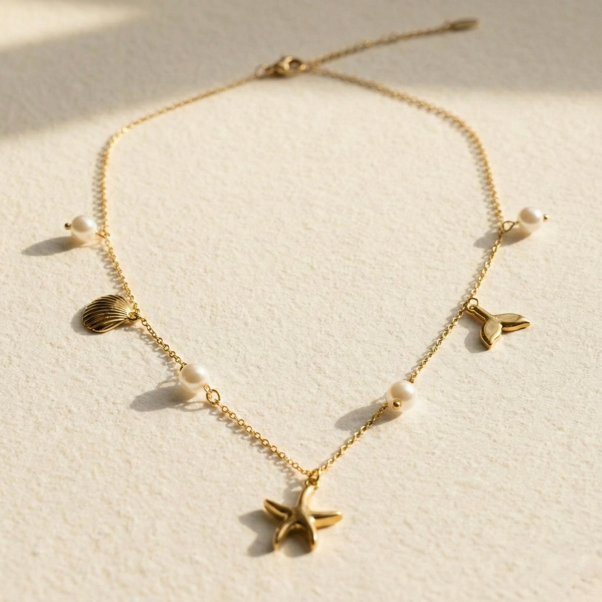A delicate ocean-inspired necklace with freshwater pearls and charming sea motifs. Lightweight, elegant, and perfect for everyday wear or beachy looks.