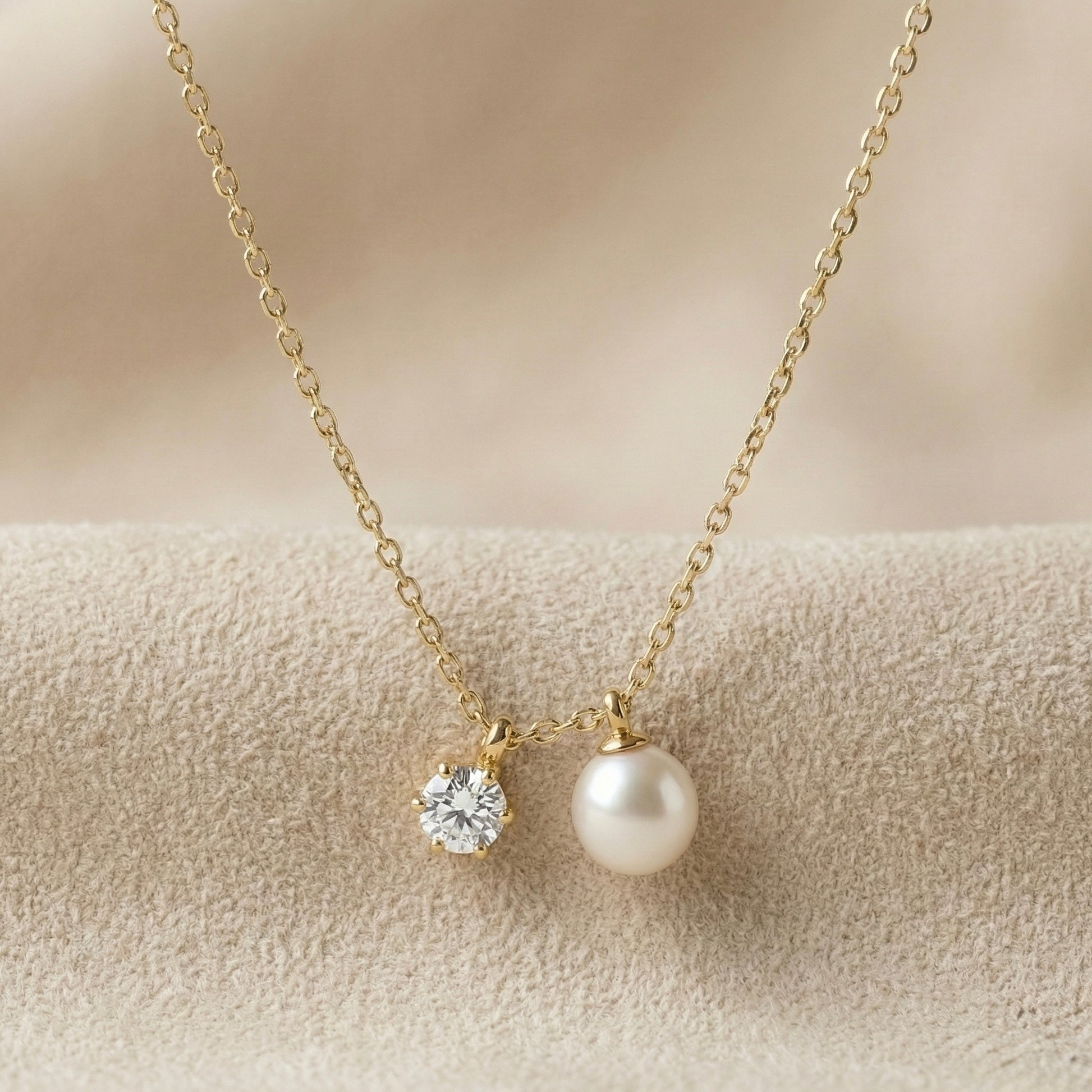 This refined design features two delicate charms — a luminous pearl and a sparkling crystal — suspended gracefully on a fine champagne gold chain. Together, they represent purity, love, and modern femininity.