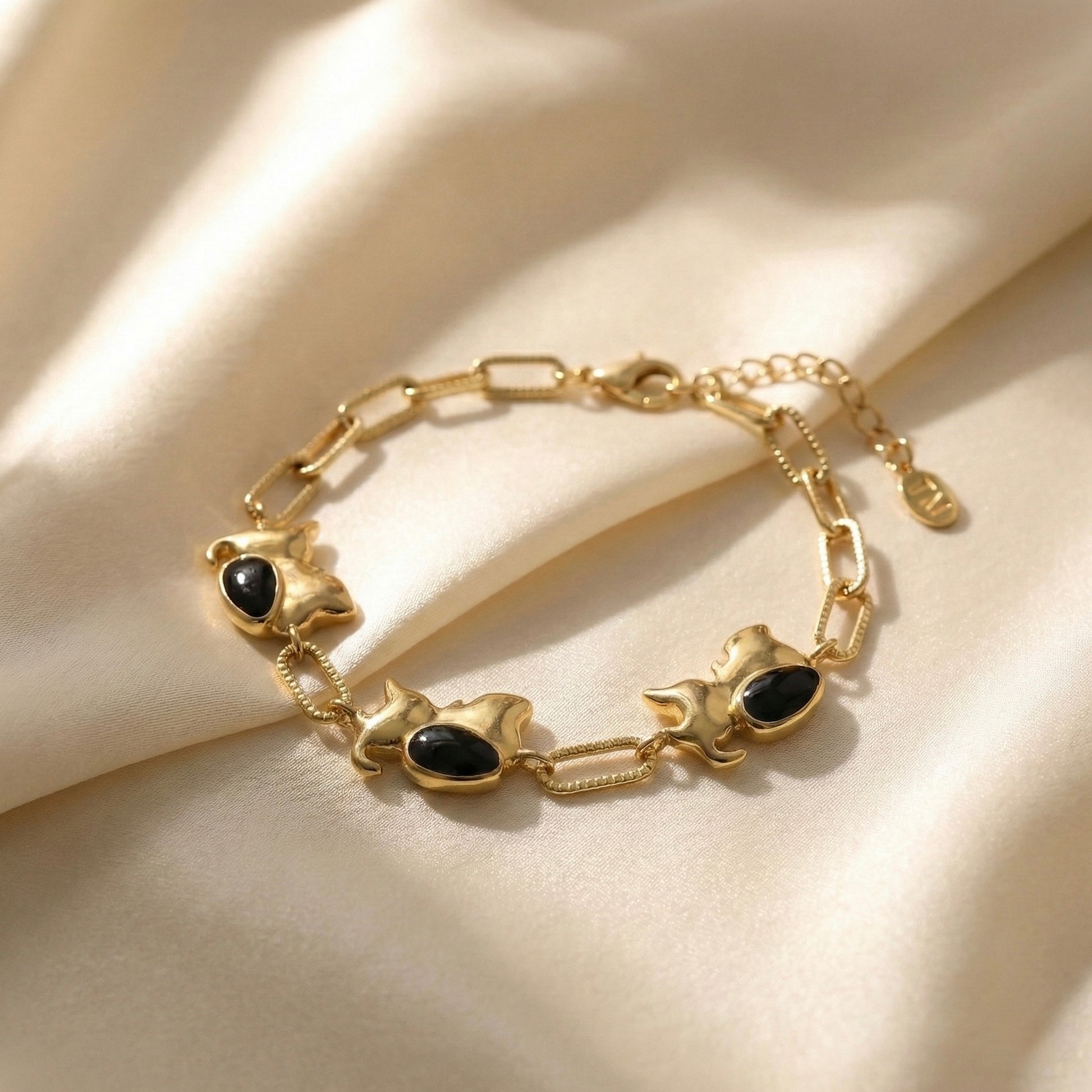 A gold plated bracelet featuring adorable puppy charms with black ear detailing — playful, premium, and perfect for dog lovers.