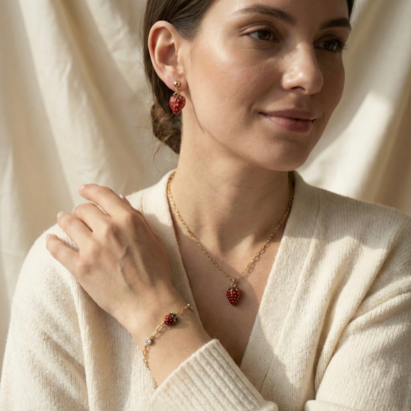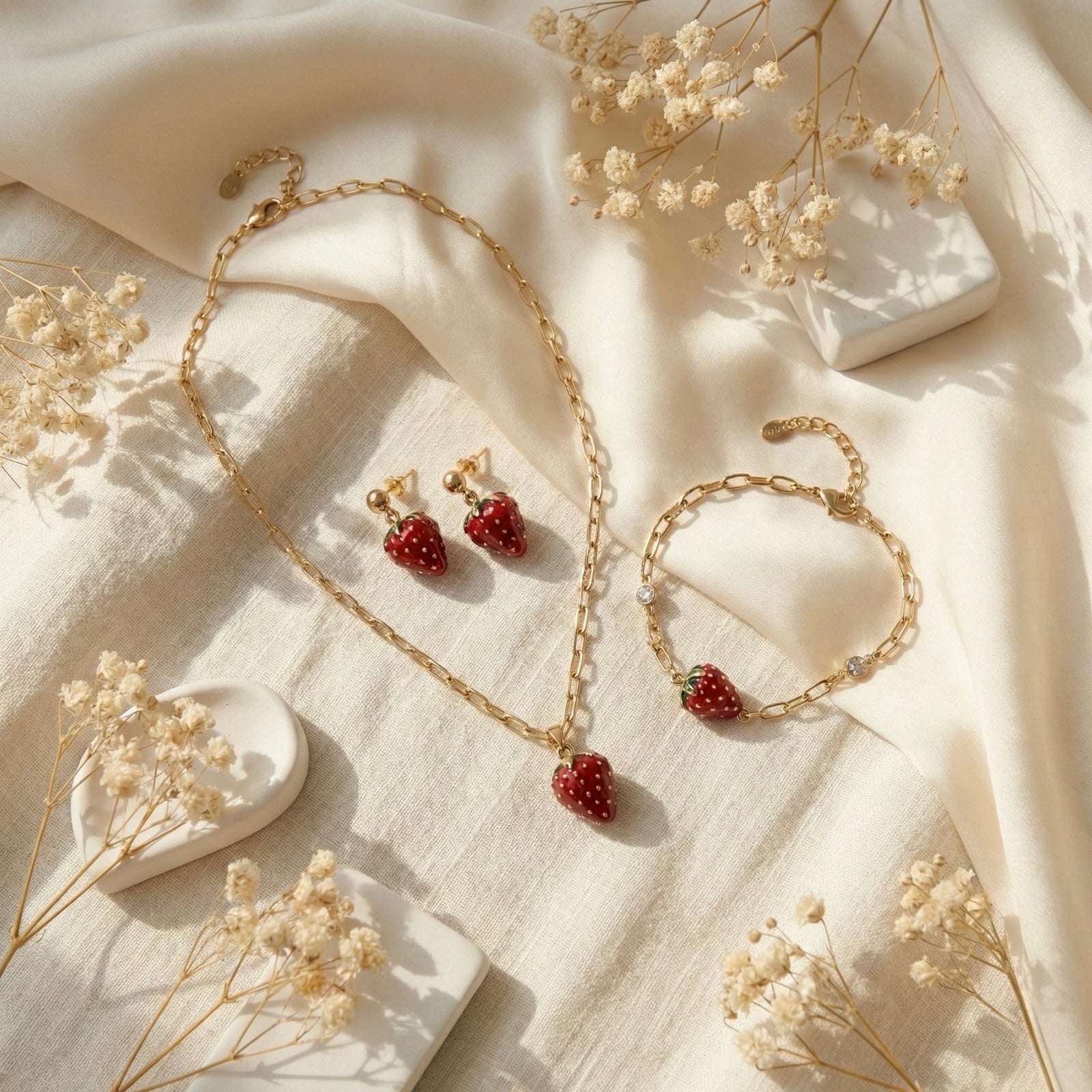A strawberry charm jewellery combo featuring a necklace, bracelet & earrings — cute, classy, and gift-ready.