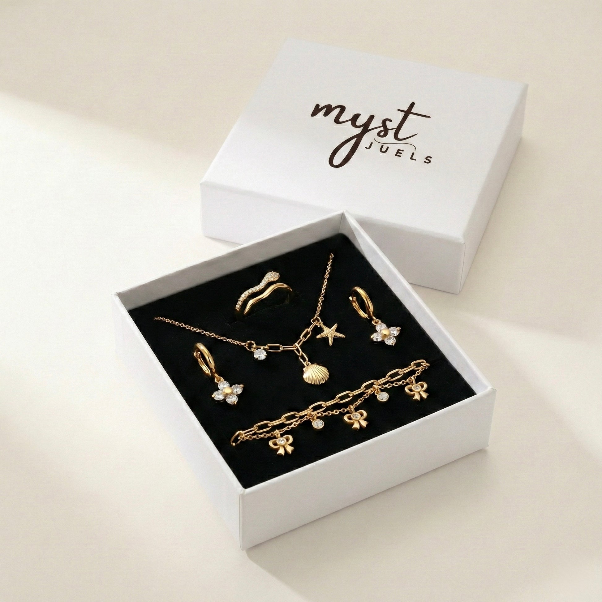 The floral zircon earrings add a soft sparkle near the face, while the bow charm bracelet brings playful elegance to the wrist. The three-charm necklace anchors the look with coastal-inspired motifs, and the pavé ring completes the set with refined brilliance.